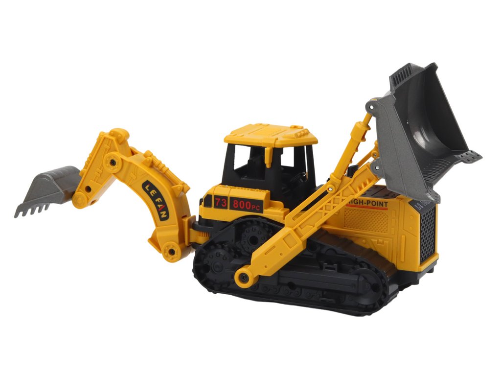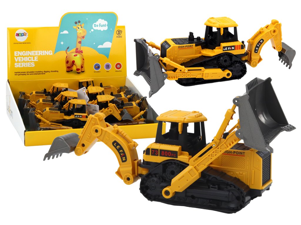 Верижен багер с две жълти кофи е впечатляваща строителна играчка, която грабва вниманието на деца и възрастни със своята многофункционалност и здрава конструкция. Предната широка кофа улеснява заравянето на големи количества пръст, докато задната по-малка кофа е идеална за по-прецизни задачи. И двете кофи са регулиращи се, което разширява възможностите за игра и стимулира креативността. Жълтият дизайн придава на багера привлекателен вид, а устойчивите материали осигуряват безопасна и дълготрайна забавa.