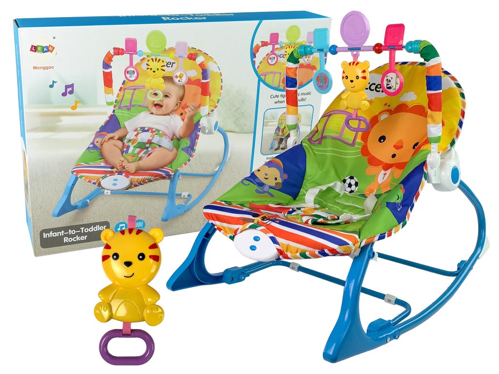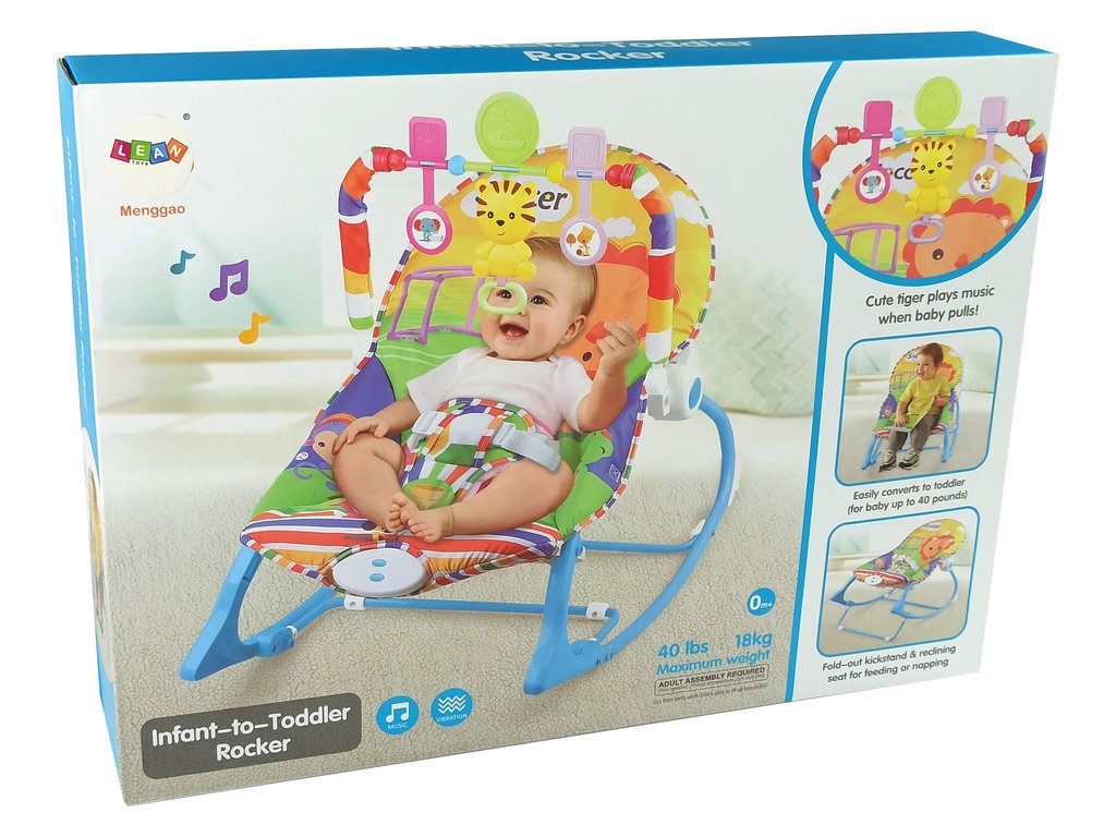 Вибриращият люлеещ се шезлонг работи с 3 батерии AA 1,5V, които не са включени в комплекта. Подходящ е за бебета от първите дни след раждането. Отговаря на стандарта EN71. Играчката е изработена от сертифицирани материали.