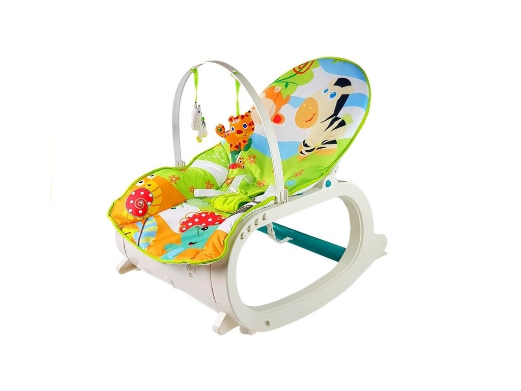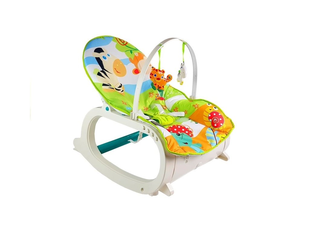 Комфортно вибриращо шезлонгче за бебе 2в1, в което вашето дете може да се отпусне и да играе. Бяло-зелено люлеещо шезлонгче с естествени мотиви, които със сигурност ще зарадват всяко малко бебе. Шезлонгчето е предназначено за новородени и по-големи бебета – до 3 години, с максимално тегло до 20 кг.