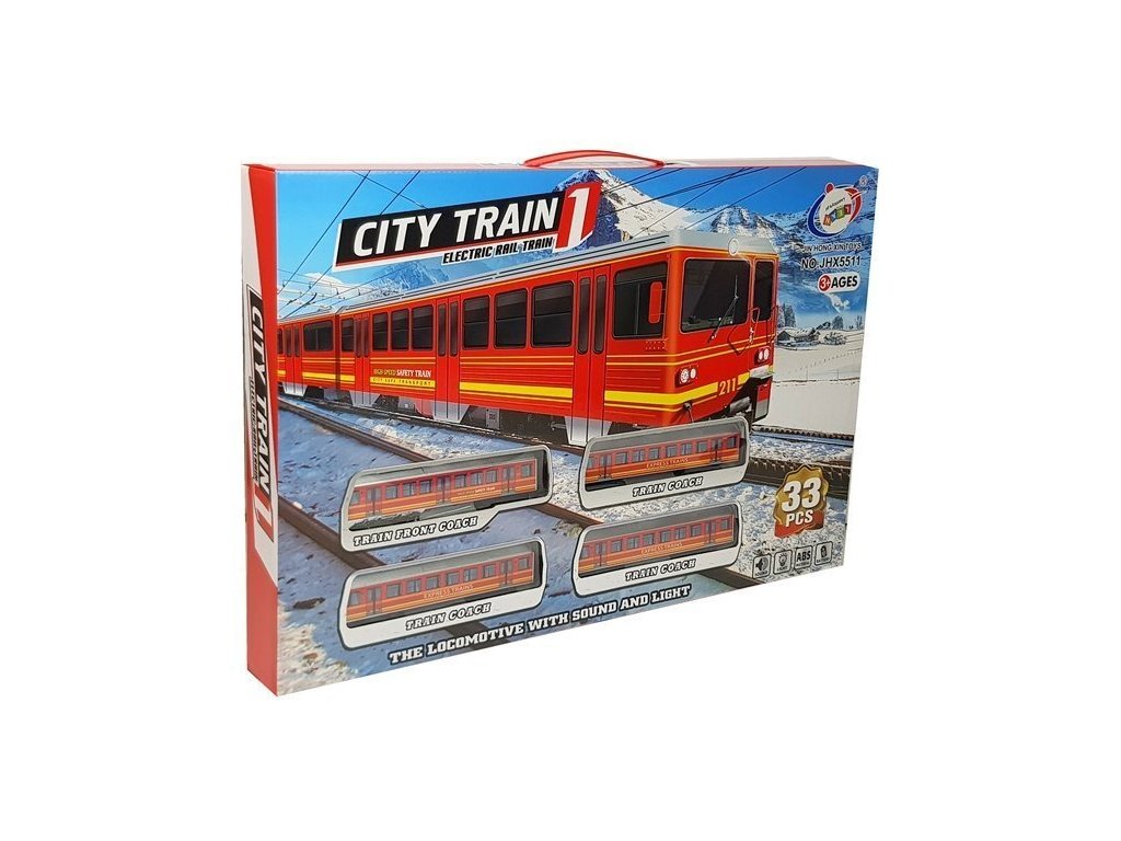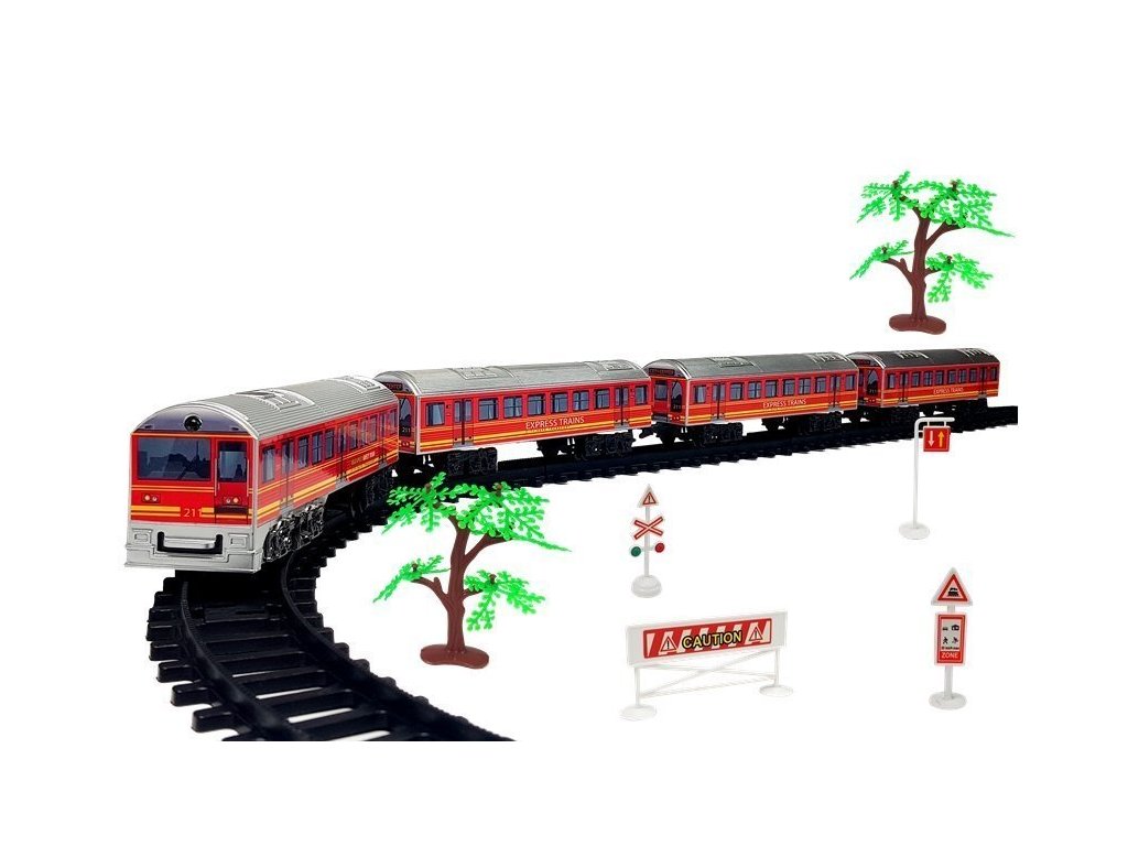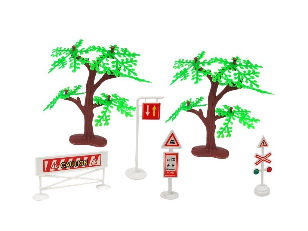 Комплект за изграждане на влак с релси 33 части, включващ разнообразие от релси, строителни елементи и аксесоари. Сред тях са прави и изкривени релсови части, дървета и пътни знаци.