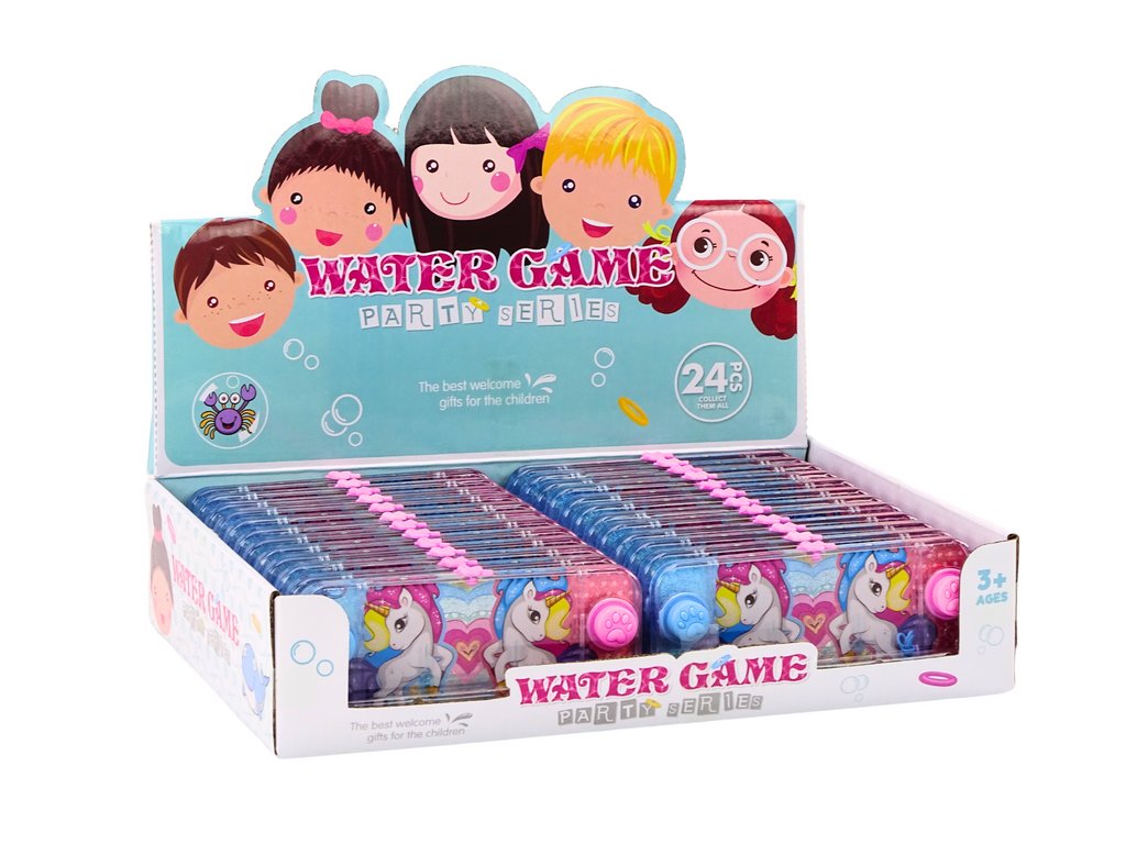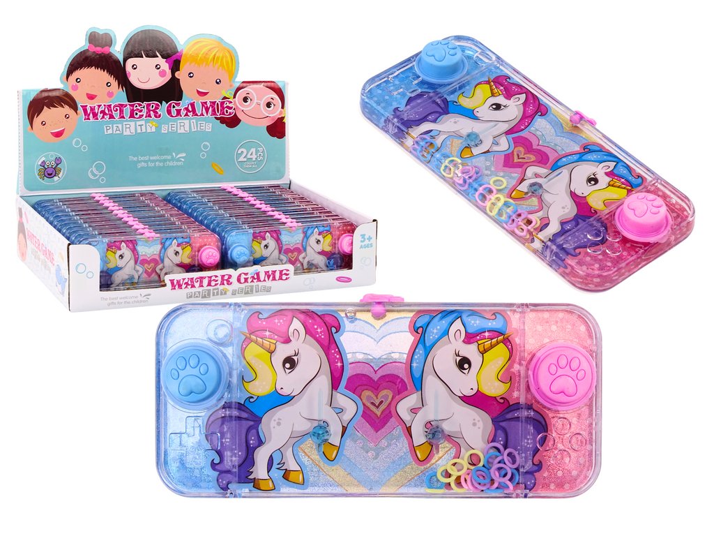 Тази класическа водна игра с тема розов еднорог е популярна като малка правоъгълна играчка. Механизмът ѝ е прост, но много завладяващ. Играта е правоъгълна, което я прави удобна за хващане с ръка. От двете страни на устройството има два розови и сини бутона, украсени с животински лапички. Тези бутони са ключови за играта и са лесно достъпни за пръстите на играча.