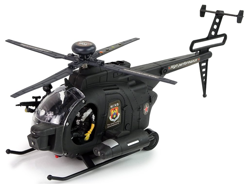 Военен хеликоптер черен е изработен в черен цвят, с широко шаси, което улеснява кацането. Благодарение на широко разположените крила с цветни светлини и звуци на фона, играта ще бъде реалистична и забавна. Две команди – едната за управление, а другата за стрелба! Колелата са монтирани под хеликоптера, за да му позволят движение.