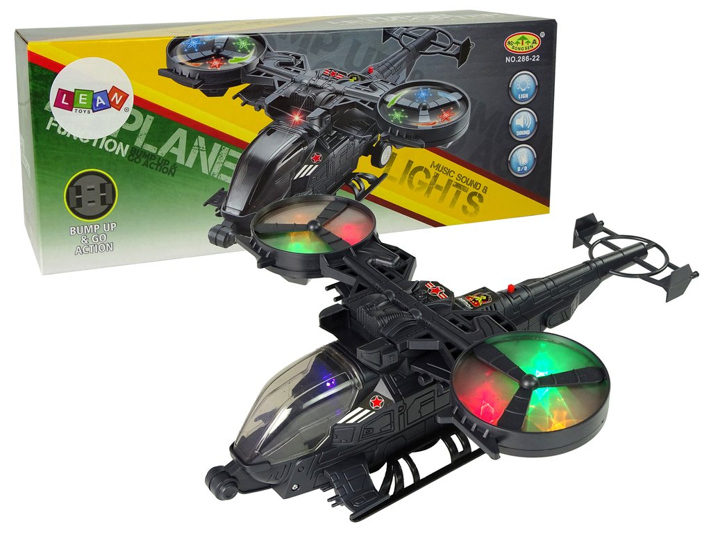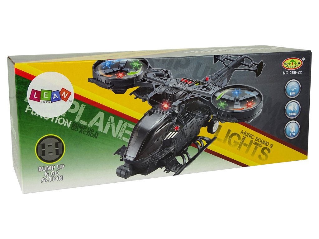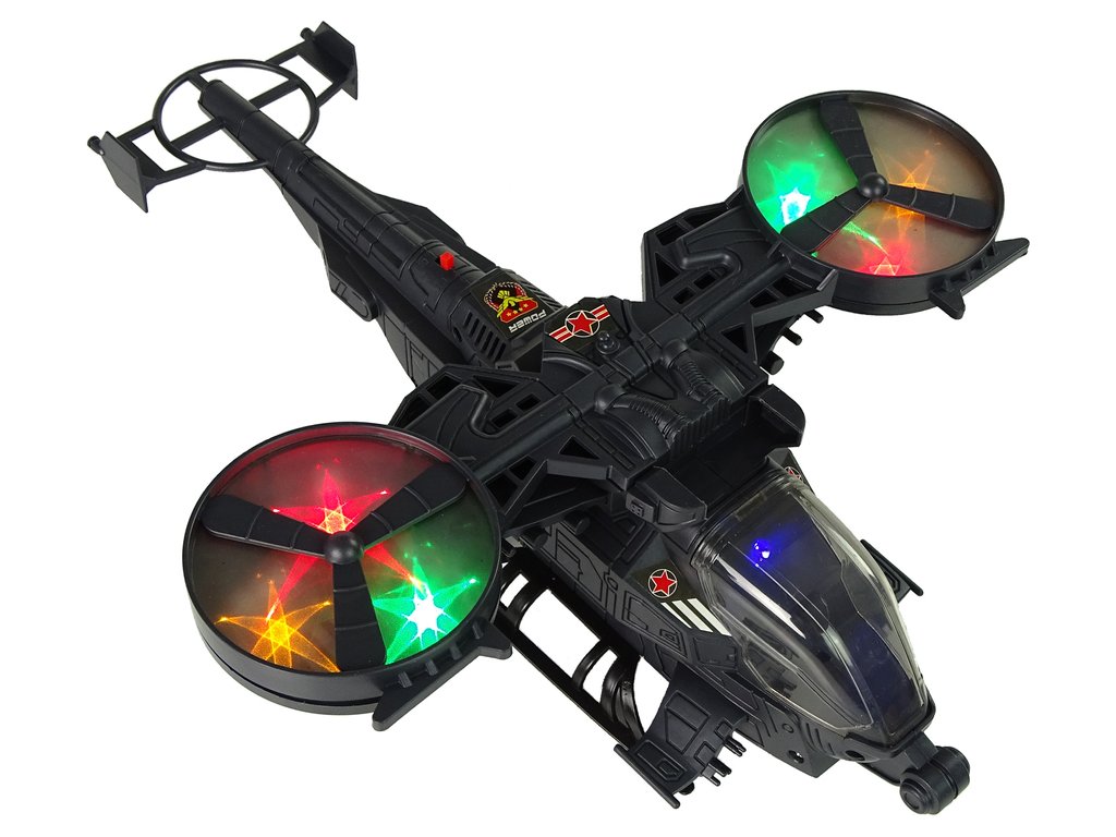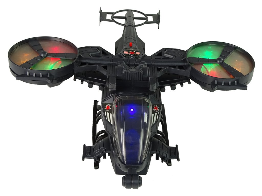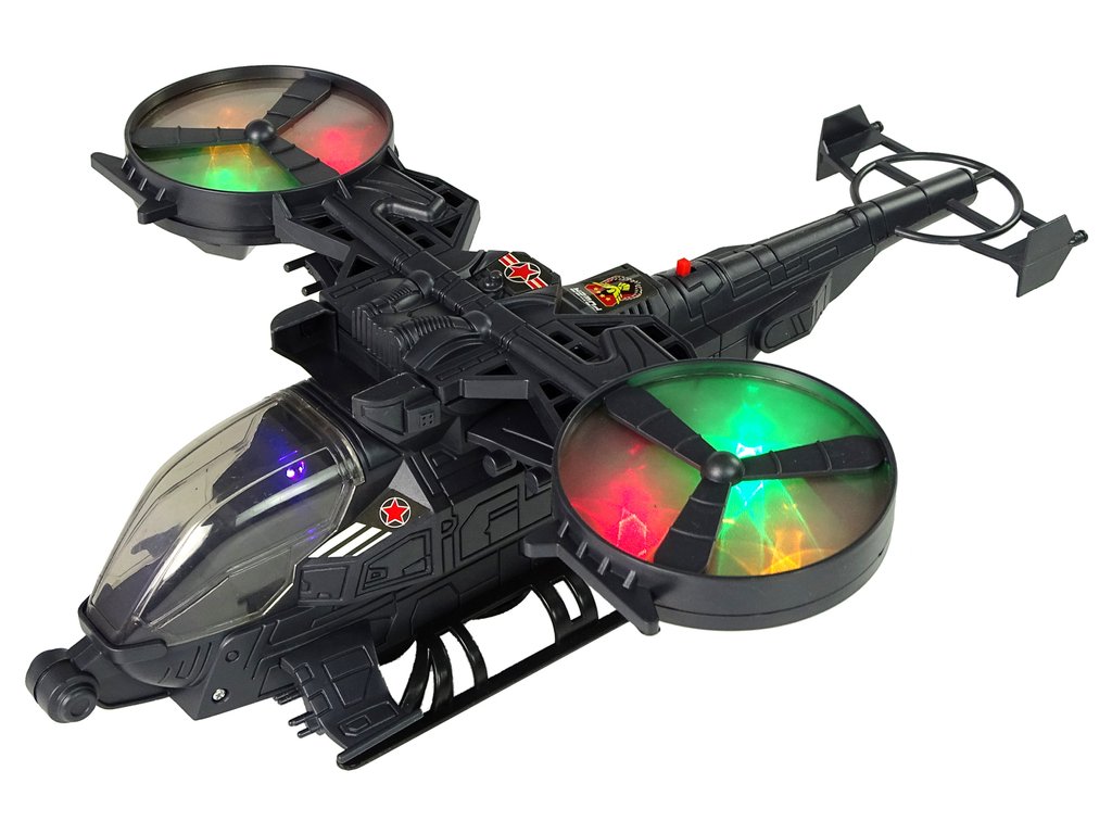 - Хеликоптерът е изработен в сиви и тъмни тонове, което улеснява камуфлажа и позволява да се скрие от предстоящия противник. Всички детайли са изработени с внимание към най-малките елементи, за да направят играта приятна за всеки малък момче. Изработен е от одобрен, здрав пластмасов материал. На крилата и по цялото тяло има военни стикери. Оборудван е с огромни въртящи се крила, които светят в различни цветове. Светлинните ефекти са подкрепени и със звукови ефекти, като звук на излитане и стрелба. Под хеликоптера има монтирани колелца, благодарение на които той може да се движи.
