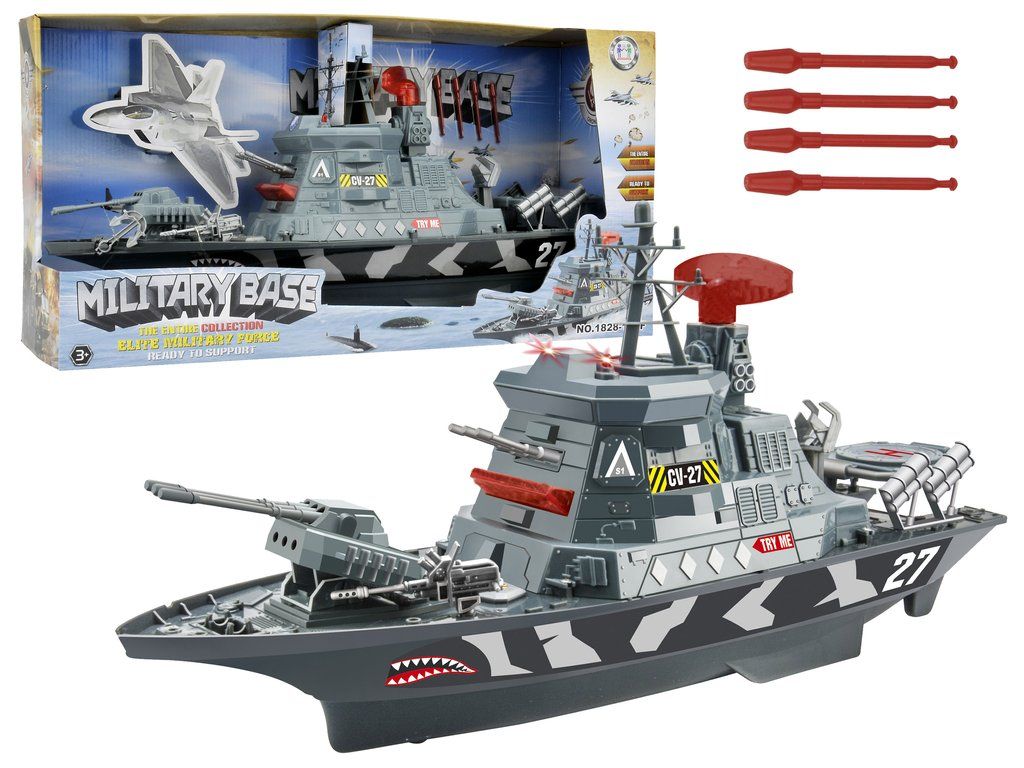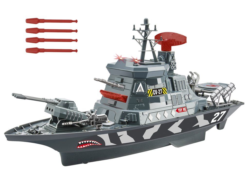 Военният кораб с ефекти разполага с четири бутона, всеки от които активира звукови сигнали и различна комбинация от светлинни ефекти. При натискане на някой от бутоните радарът се завърта и светва заедно със звуков ефект. Чуват се звуци от морето, стрелба, аларми и капитанска реч на английски.