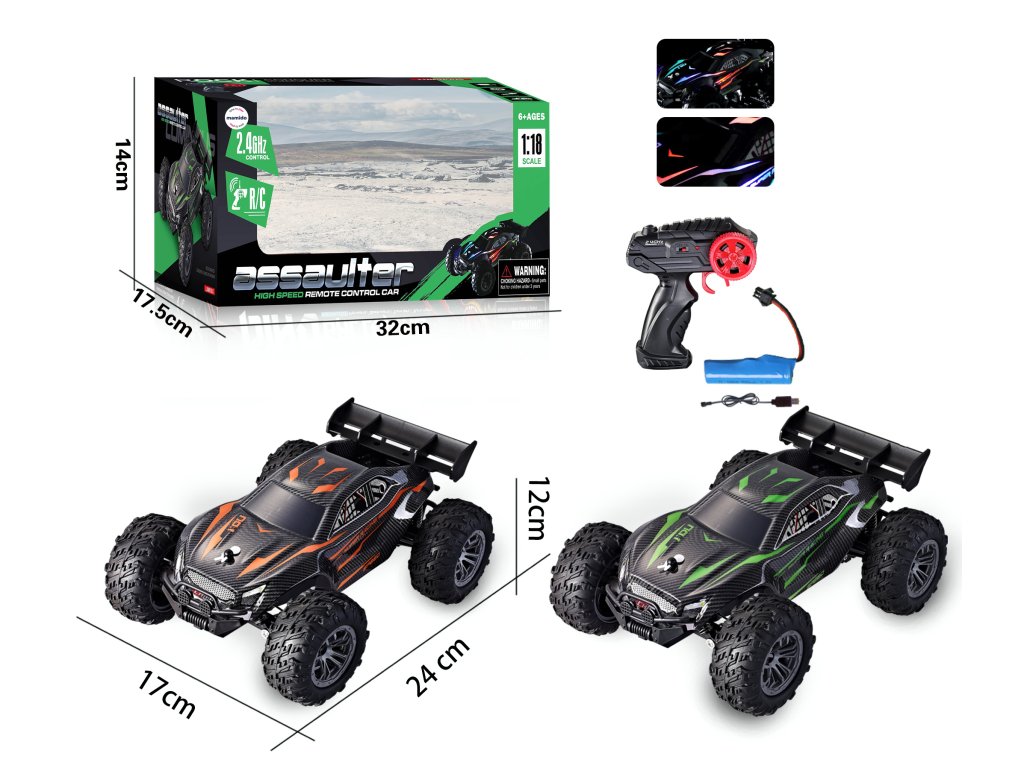 Изживейте бързо действие с RC офроуд автомобил в мащаб 1:18, който може да се справи с всяка повърхност! Благодарение на големите гуми с дълбок протектор, той може да кара по асфалт, трева и чакъл. Стабилното 2,4 GHz дистанционно управление осигурява прецизно управление без смущения, така че ще се насладите на шофиране без компромиси.